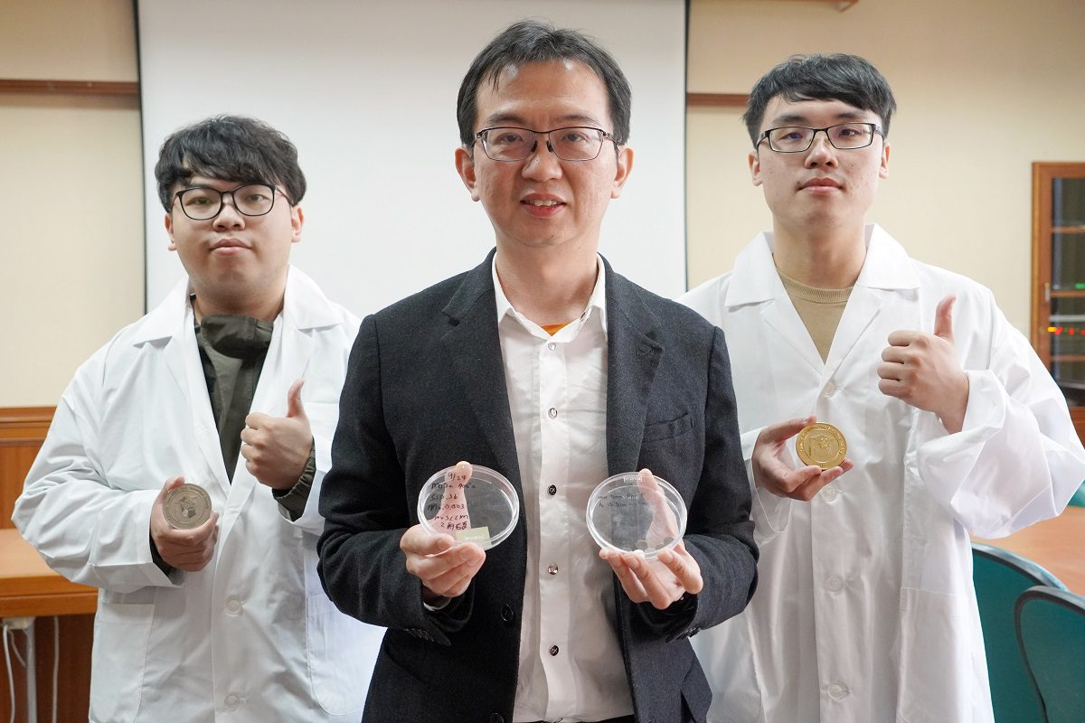醫學工程學系助理教授歐信良的實驗室團隊榮獲1金1銀,張博彥同學說,人工膝關節植入人體後容易發生鬆脫的問題,實驗室以新技術開發「磁控濺鍍成長鍶摻雜氫氧基磷灰石薄膜之特性研究並應用於鈦合金生醫植入材」,提高醫材與骨頭整合的效果,讓病患可以恢復得更好,很開心能獲得金牌肯定。
