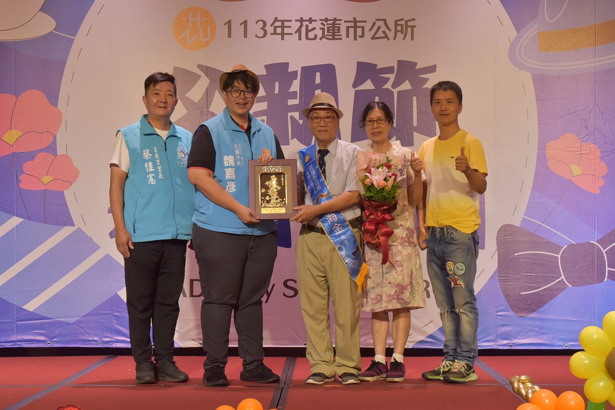 ▲花蓮市父親代表戴著紳士帽與墨鏡接受市長魏嘉彥(左二)表揚,市代會主席李振瑋(左)、縣議員韓林梅(右)也上台祝福。(圖/市公所提供)