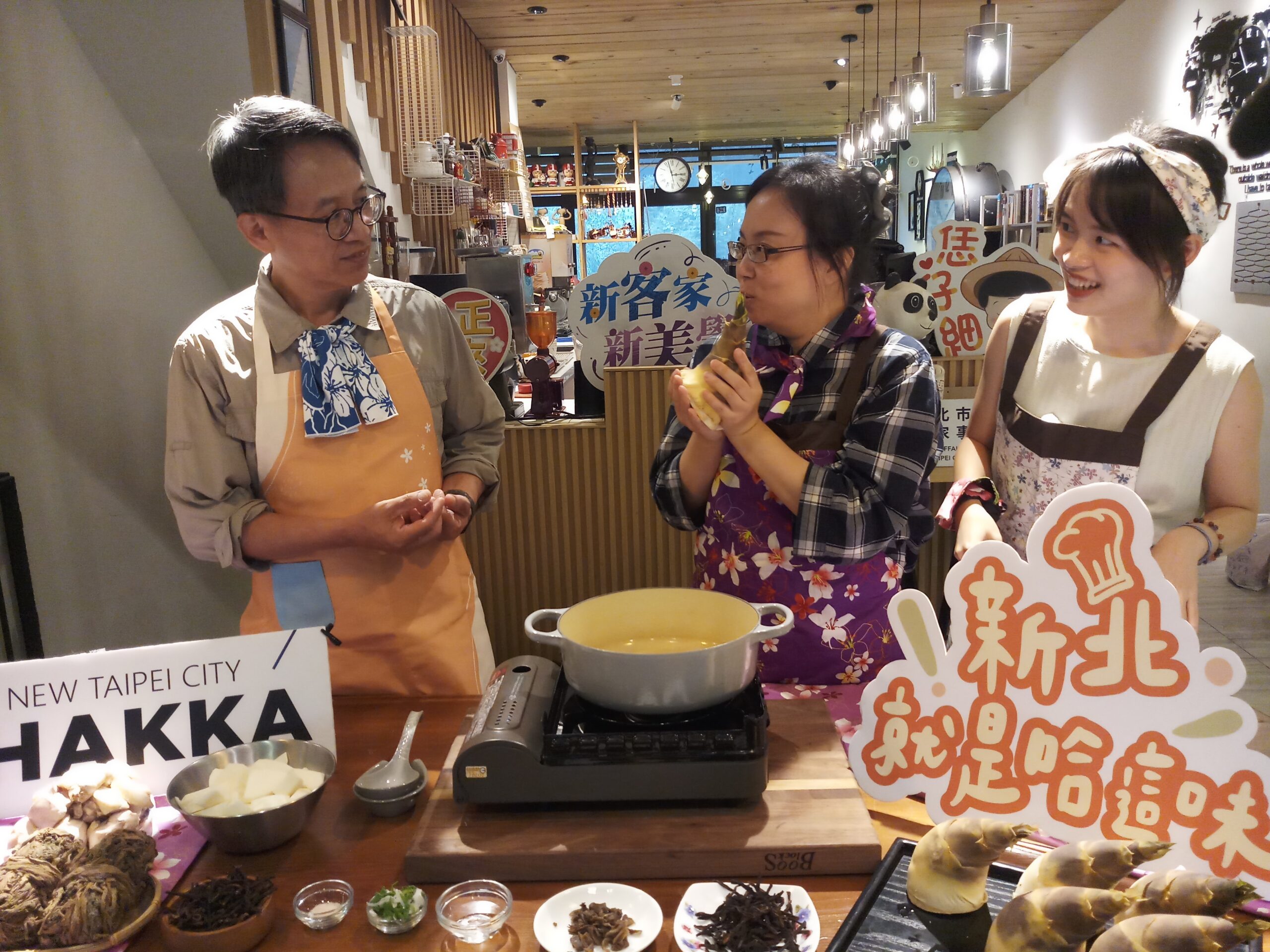 ▲時間厝咖啡廳黃老闆(左)及ㄚ樺媽媽(中) 和智庫團成員鄭焄妤(右)共同製作竹筍料理。(圖/新北市客家事務局 提供)