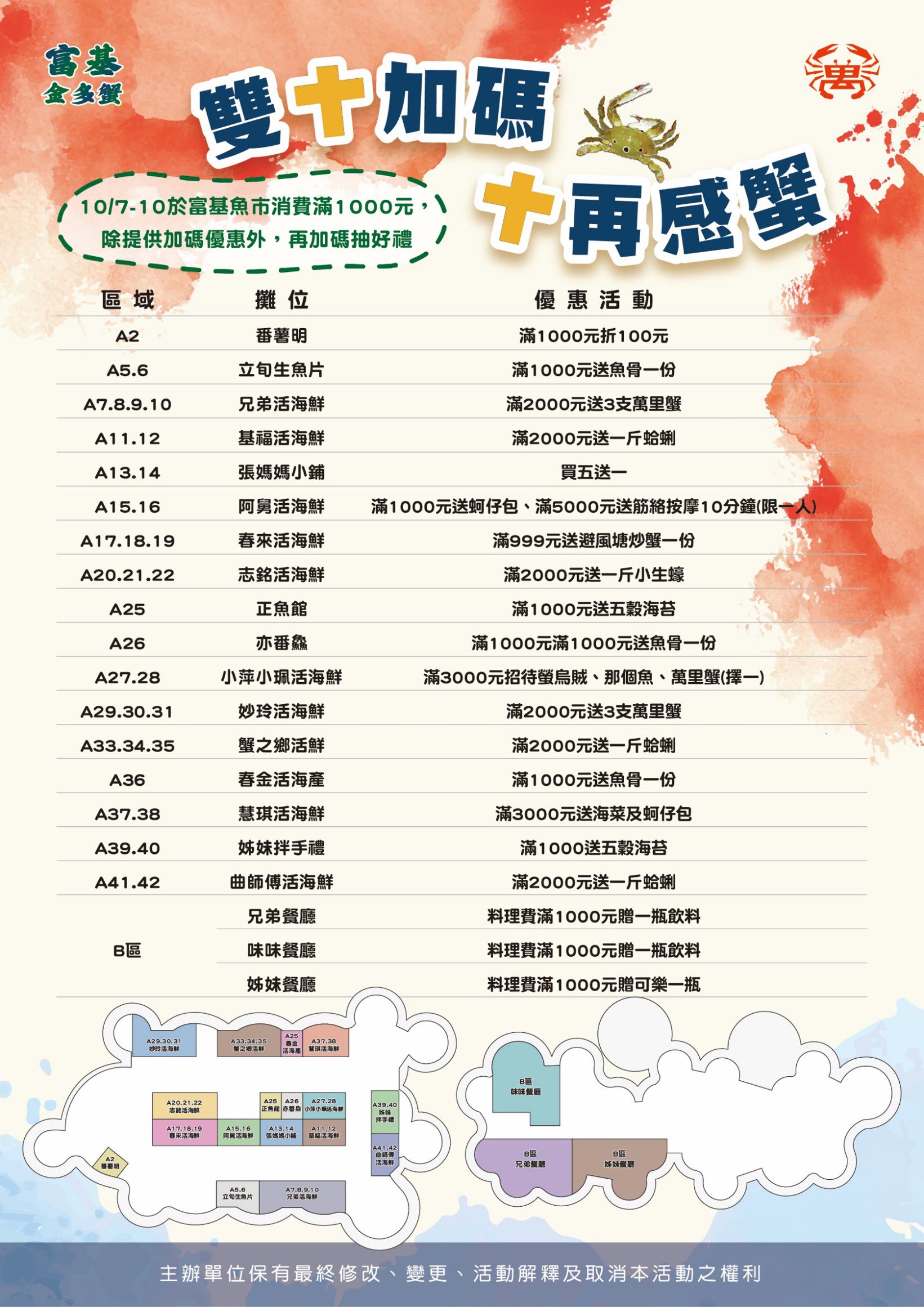 正值萬里蟹盛產季節,新鮮現撈的萬里蟹做成避風塘料理或是清蒸都是饕客必點美味!魚市內水攤海鮮使用活水畜養保持活體活性,著名的萬里蟹、貢寮鮑及產地直送的海鮮應有盡有,讓饕客們能夠吃到最新鮮味美的海鮮料理,漁港內兄弟海產、味味海鮮、姊妹等餐廳也都提供代客料理,讓民眾可以即刻品嚐,且餐廳環境擁有大片落地玻璃窗,民眾可以邊嚐美食邊觀賞富基漁港最美的日落海景。7日至10日推出品海鮮優惠「雙十再感蟹」,各攤商於雙十節連續假期皆有滿額送活動。另為歡慶萬里蟹季,推出「金多蟹」抽獎活動,只要在富基魚市水灘、餐廳消費滿1,000元並完成指定步驟即可參加,活動即日起至10月29日止,獎品包含100元抵用劵、萬里蟹文宣品及精美小禮物,另外也準備了國慶假期促銷傳單供民眾參考,歡迎全家大小一同前來富基採買尚青海鮮。