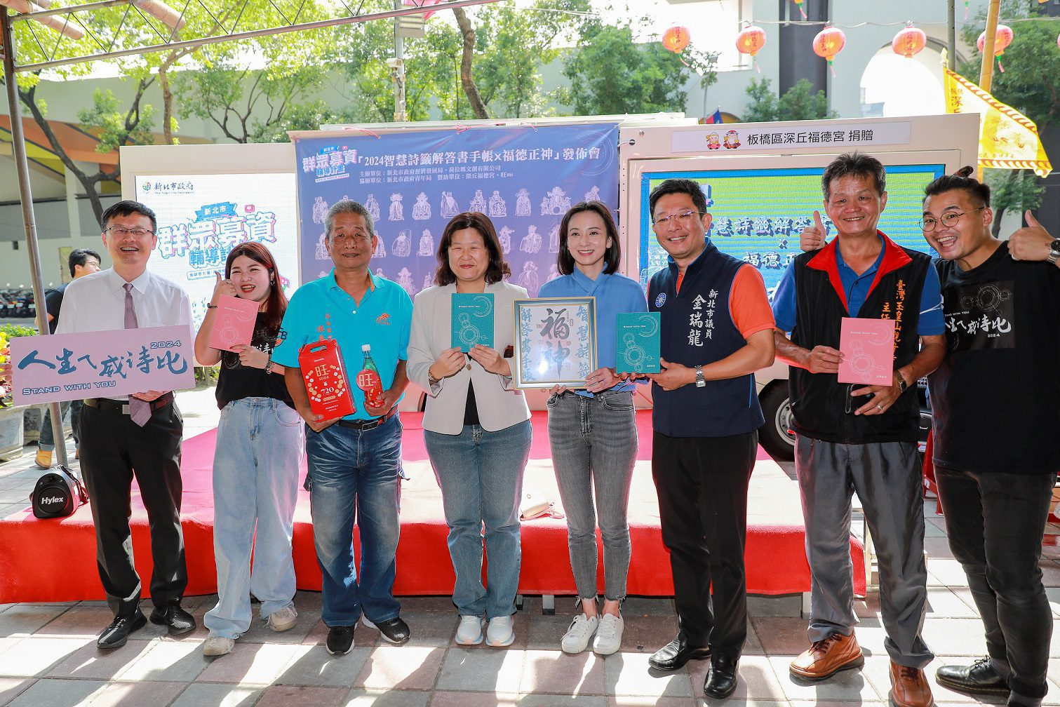 ▲經發局今(15)日於板橋深丘福德宮舉辦「新北群眾募資輔導計畫『2024智慧詩籤解答書手帳x福德正神』發布會」。(圖/新北市經發局提供)