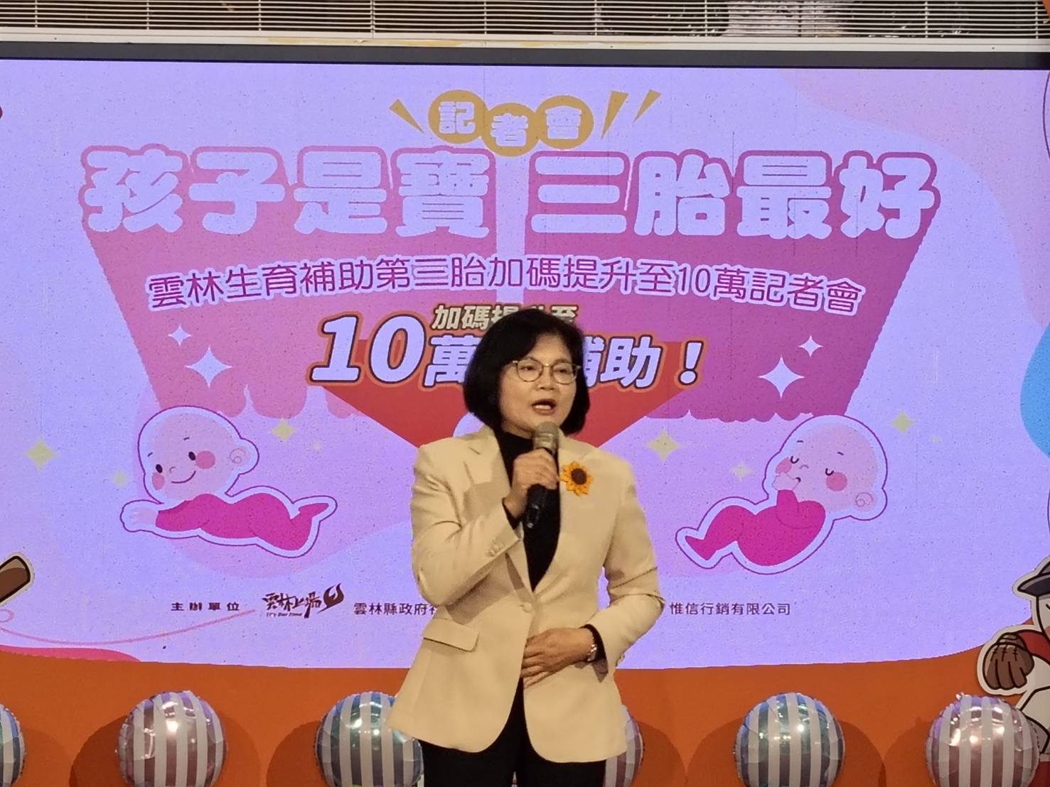 雲林縣政府於今(5)日上午辦理【孩子是寶,三胎最好─雲林生育補助第三胎加碼提升至10萬】記者會,由張麗善縣長宣布自115年1月1日起只要在生產前父或母一方設籍雲林滿八個月,生產後於雲林登記之寶寶,第一胎至第二胎補助至3萬元,第三胎起每胎更提高補助至10萬元。